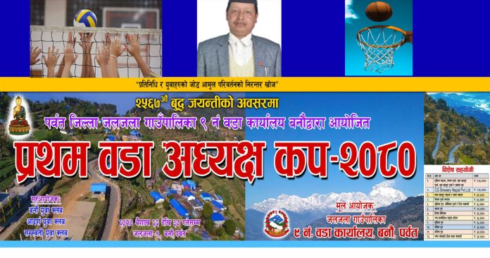 पर्वत । पर्वतको जलजला गाउँपालिका वडा नं ९ बनौमा बैशाख २२ गते दखि प्रथम वडा अध्यक्ष कप हुने भएको छ । वडा कार्यालय बनौको मुख्य आयोजना र बनौ युवा क्लब,आदर्श युवा क्लब, सरस्वती युवा क्लबको सह— आयोजनामा विविध प्रतियोगितासंगै सांस्कृतिक कार्यक्रम हुन लागेको हो । “जनप्रतिनिधि र युवाहरुको जोड आमुल परिवर्तनको निरन्तर खोज” भन्ने मुल नाराका साथ २५६७ औँ बुद्ध जयन्तीको अवसरमा आयोजित प्रथम वडाअध्यक्ष कपमा सर्वाधिक राशि पुरस्कारको पुरुष भलिबल प्रतियोगिता, पुरुष बास्केट बल प्रतियोगिता, महिला भलिबल र प्रौड भलिबल प्रतियोगिता आयोजना गरिएको वडा अध्यक्ष गौ बहादुर पुर्जाले जानकारी दिनुभयो ।
