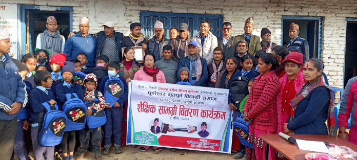पर्वत÷ पूर्णेश्वर भूतपूर्व विद्यार्थी समाजको आयोजनामा कुश्मा नगरपालिका वडा नं.–४ निवासी पुनम बसेलले शैक्षिक सामग्री उपलब्ध गराएका छन् । उनले आफ्ना छोराहरुको जन्मदिनमा हुने फजुल खर्च कटाएर आइतवार दिउँसो एक कार्यक्रमका बीच उक्त सामग्री उपलब्ध गराएका हुन् ।