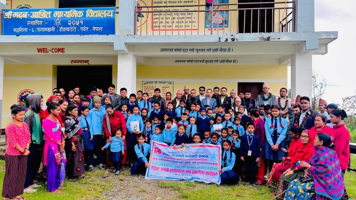 पर्वत : पर्वतको महाशिला गाउँपालिका–६ मा रहेको मदन आश्रित माध्यमिक विद्यालयमा अध्ययनरत विद्यार्थीहरूलाई शैक्षिक सामग्रीहरू वितरण गरिएको छ ।