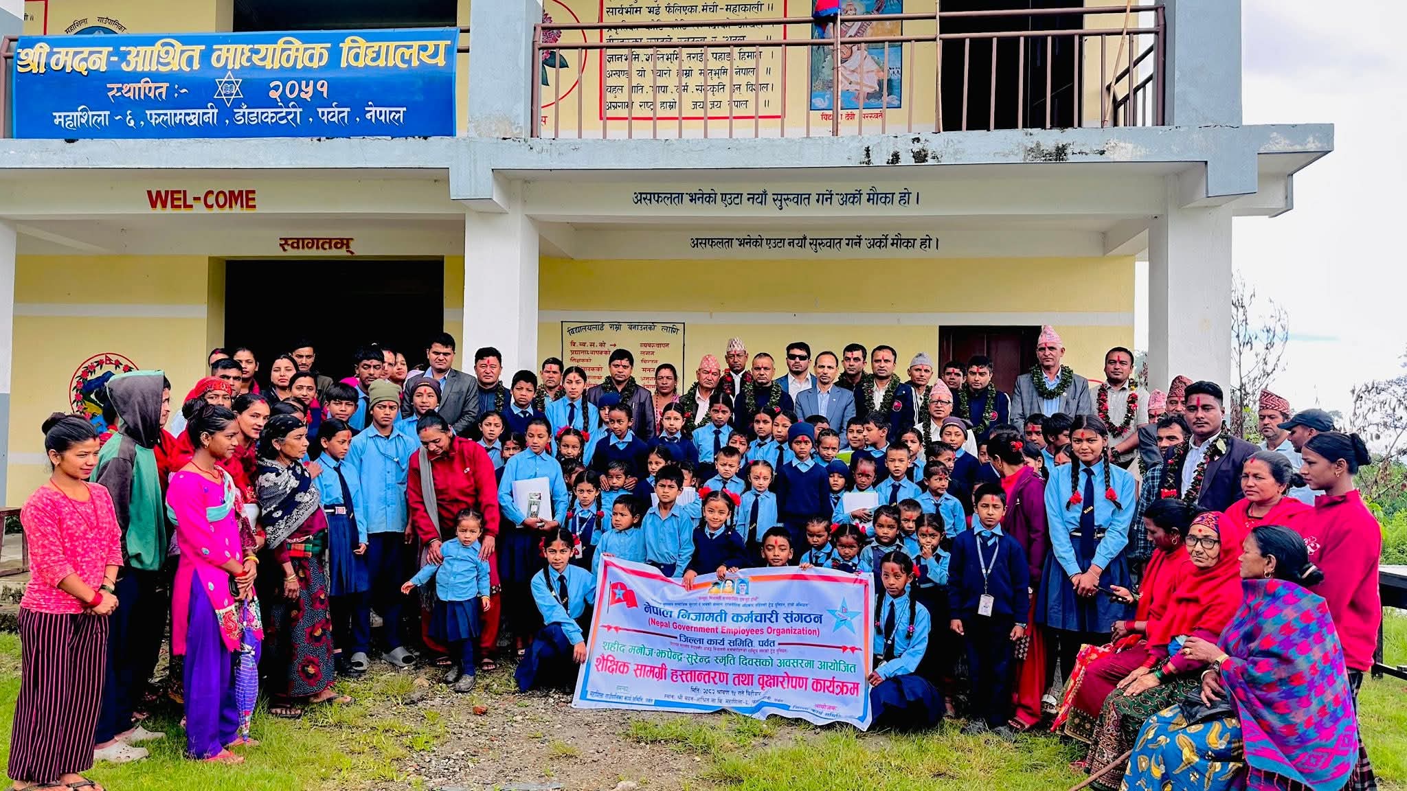 नेपाल निजामती कर्मचारी सङ्गठन जिल्ला कार्यसमिति पर्वत तथा सङ्गठनको महाशिला गाउँपालिकाको कार्यसमितिको समन्वयमा विद्यालयको बाल कक्षादेखि १० कक्षासम्म अध्ययनरत करिब ८० जना बिद्यार्थीहरुलाई शैक्षिक सामग्रीहरू वितरण गरिएको हो । निजामती कर्मचारीहरूको हक, अधिकार तथा पेसागत संरक्षणका लागि भएका कर्मचारी आन्दोलनका क्रममा सहिद बनेका मनोज जोशी, सुरेन्द्र विक र झपेन्द्र कार्कीको स्मृतिमा विद्यार्थीहरूलाई ती सामग्रीहरू वितरण गरिएको हो ।