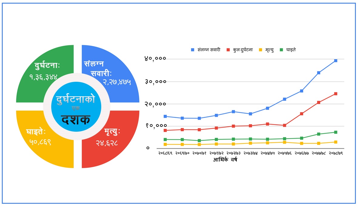दश वर्षअघि (आव २०६८/६९) को तथ्याङ्कमा कुल ८ हजार ९२ दुर्घटना भएका थिए । त्यसमा १४ हजार २ सय ८७ गाडी परेका थिए । दुर्घटनामा १ हजार ८ सय ३७ को ज्यान गएकाे र ४ हजार १९ जना गम्भीर घाइते भएका थिए । ठिक त्यसको १० वर्षपछि आर्थिक वर्ष २०७८/७९ को अभिलेखानुसार गाडी दुर्घटना ह्वात्तै बढेर २४ हजार ५ सय ३८ पुग्यो । त्याे साल ३९ हजार ३ सय ७९ गाडी दुर्घटनामा परे । ती दुर्घटनाबाट कुल २ हजार ८ सय ८३ जनाको ज्यान गएकाे भयो भने ७ हजार २ सय ८२ यात्रु गम्भीर घाइते भएका छन् ।