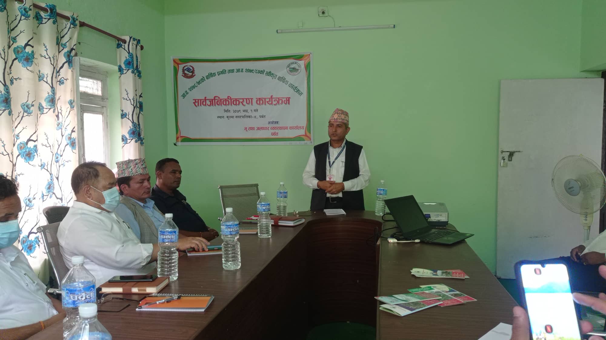 कार्यक्रममा कार्यालय प्रमुखले बार्षिक कार्यक्रम सार्वजानिक गरे पश्चात बाल्दै कार्यक्रमका प्रमुख अतिथि तथा जिल्ला समन्वय समिति पर्वतका प्रमुख विष्णुराम वि.कले कार्यालयले यस आर्थिक वर्षमा संचालन गर्न लागेका कार्यक्रमहरुको बारेमा सुझाव, सल्लाह दिदै सार्वजनिक गरेका कार्यक्रम निश्पक्ष ढङ्गले संचालन गर्न अनुरोध गर्नुभयो । वि.कले ५ जिल्ला हेर्ने कार्यालयमा ठुलो मात्रमा बजेट होला भन्ने आफुमा भान भएको बताउँदै सार्वजानिक कार्यक्रम हेर्दा हात खुट्टा बाधेर दौडी भने जस्तो भएको बताउँनुभयो । उहाँले भन्नुभयो, “५ जिल्ला हेर्ने कार्यालयलाई संघीय र प्रदेश सरकारबाट प्राप्त कार्यक्रमको बजेट हेर्दा लाग्यो, यति बजेटका कार्यक्रम त एउँटा महानगरपालिकाको वडा पनि हुन्छ ।” वि.कले प्रदेश सरकारले टुक्रे योजना लिएर प्रदेश सरकारकै बदनाम गरिहेको आरोप लगाउँनुभयो । उहाँले सार्वजनिक गरिएका कार्यक्रमहरु संचालन गर्न सवै पक्षसंग आफुले समन्वयात्मक भुमिका खेल्ने पनि प्रतिवद्धता जनाउँनुभयो ।