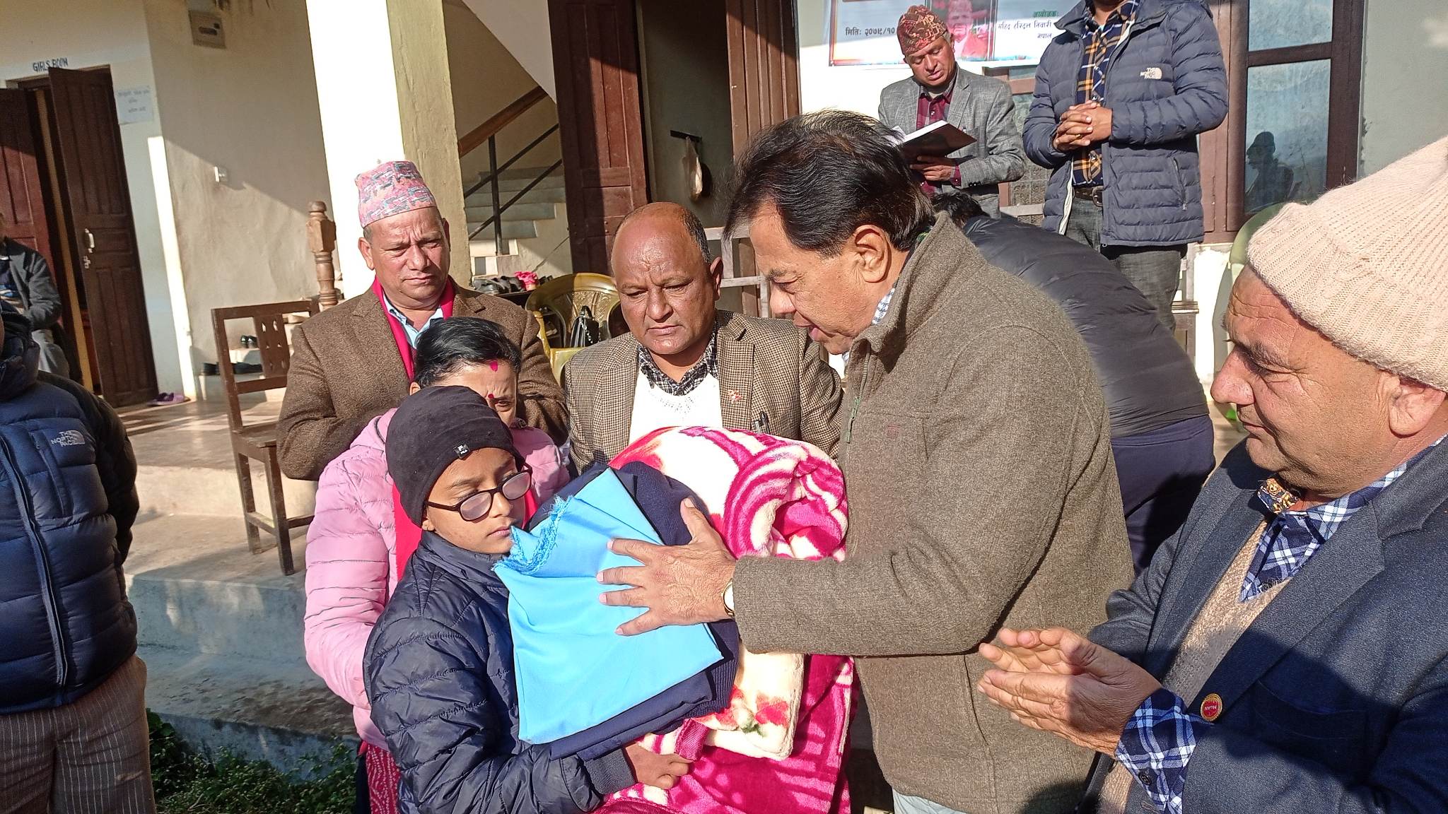 सहित हरिदत्त तिवारी स्मृति प्रतिष्ठानले सदरमुकाम कुश्मा बजार स्थित शिवालय माध्यमिक विद्यालयको दृष्टिविहीन स्रोत कक्षामा अध्ययनरत बिद्यार्थीहरुलाई ब्लाङकेट र पोसाक वितरण गरिएको हो । पर्वत सहित म्याग्दी र बागलुङका समेत गरेर १२ जना बालबालिकाहरू रहेकामा उनीहरू सबैलाई कपडा वितरण गरिएको हो ।