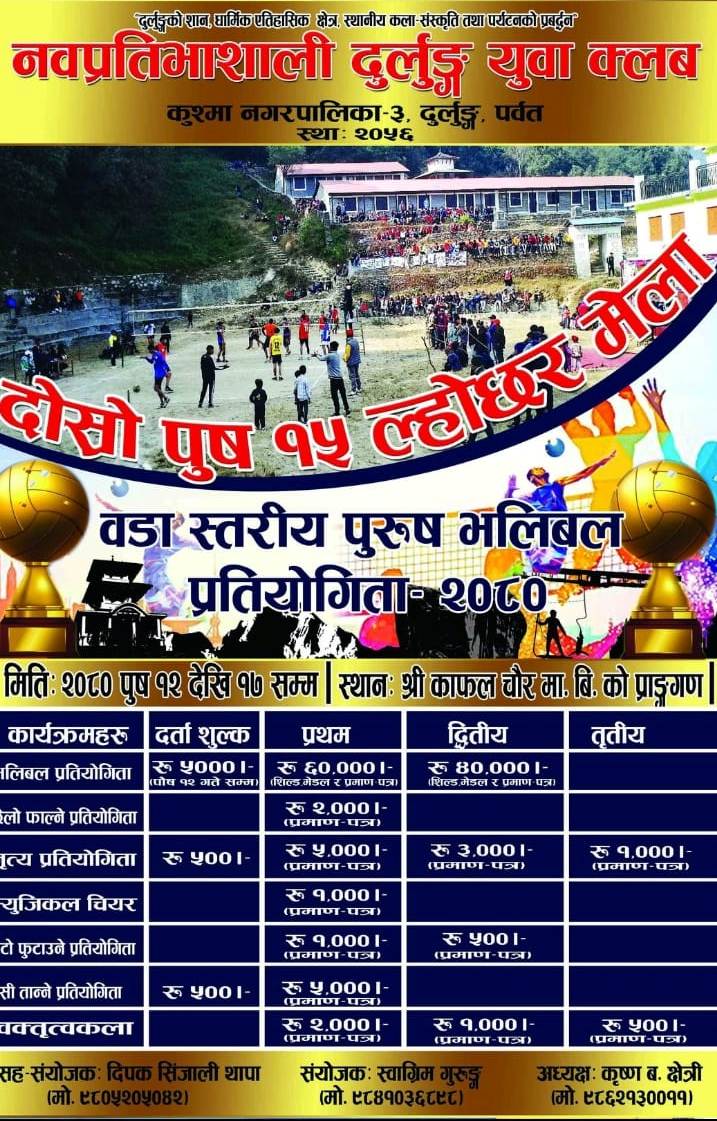 भलिबल प्रतियोगितामा प्रथम हुनेले ६० हजार शिल्ड,मेडल,प्रमाणपत्र र द्धितिय हुनेले ४० हजार शिल्ड,मेडल र प्रमाणपत्र प्राप्त गर्ने कार्यक्रम संयोजक स्वाग्रिम गुरुङले जानकारी दिए । मेलामा हरेक दिन स्थानिय तथा राष्ट्रिय कलाकारहरुको सांस्कृतिक प्रस्तुति रहने आजयोजकले बताएको छ ।