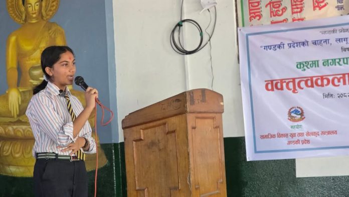 पर्वत । जिल्लाको कुश्मा नगरपालिकामा आयोजना गरिएको नगर स्तरीय वक्तृत्वकला प्रतियोगीतामा नमुना आवासीय माध्यमिक विद्यालयकी सजता गिरी प्रथम भएकी छिन् । लागू औषध दुब्र्यसनी बिरुद्धको सचेतनामूलक कार्यक्रम अन्तर्गत जि एण्ड जि मिडिया प्रा.लि.ले उक्त कार्यक्रमको आयोजना गरेको हो । प्रतियोगीतामा नारायण माविका सन्तोष पौडेल द्धितिय भएका छन् भने काफचौर मावि दुर्लुङका अभिशेक गिरी तृतिय भएका छन् । प्रतियोगीतामा कालीगण्डकी एकेडमीको सुयोग श्रेष्ठले सान्तवना स्थान हासिल गरेका छन् ।